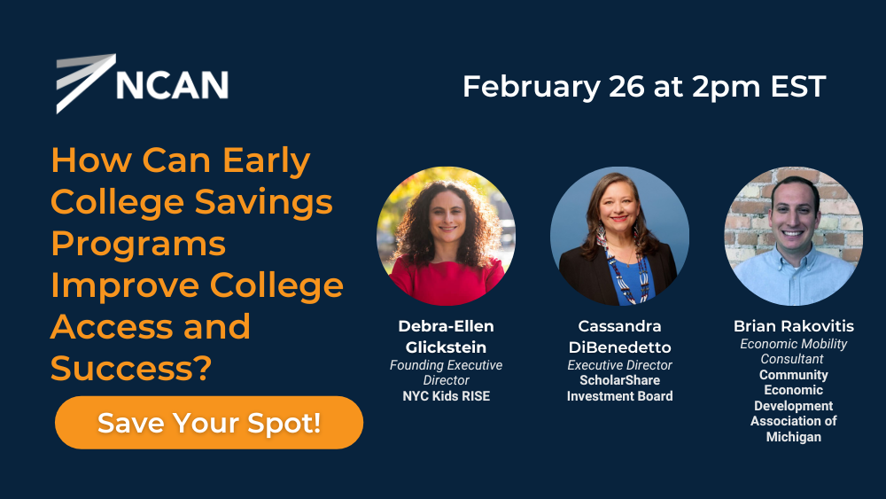 Early wealth building programs, including Children’s Savings Accounts (CSAs), 529 plans, and other early college savings initiatives have gained traction in recent years as a tool for accelerating economic mobility, improving college-going identity, and increasing postsecondary enrollment—particularly for students from low-income backgrounds. Join us to learn how these programs align with National College Attainment Network (NCAN) members’ postsecondary access and success work. When paired with advising and Free Application for Federal Student Aid (FAFSA) completion, CSAs have even greater potential to help make education after high school more attainable and affordable. From statewide initiatives to citywide nonprofit models, CSA programs vary widely in design and scale, but their reach is growing. As of 2023, 5.8 million children had access to CSAs through a state or local initiative. Leaders from California, New York, and Michigan will share how CSA programs are designed, funded, and implemented to maximize impact and meet the distinct needs of the communities they serve. Participants will leave with a deeper knowledge of the opportunities and benefits to college access organizations that collaborate with early college savings programs, and how CSA programs fit into the broader landscape of postsecondary access and success. Presenters: - Debra-Ellen Glickstein, Founding Executive Director, NYC Kids RISE