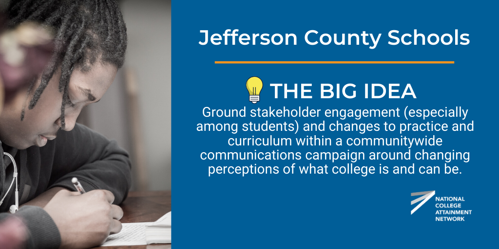 In February, NCAN released “The Data That Matter and the Plans That Work: New Districtwide Approaches to Student Success Beyond High School,” a collection of case studies about five school districts and partner organizations participating in the To & Through Advising Challenge. These organizations’ “big ideas” center on changing postsecondary advising by incorporating fit and match in college selection, improving FAFSA completion, reducing summer melt, and using postsecondary outcomes data to inform practice. This post focuses on Jefferson County (Alabama) Schools whose big idea is grounding stakeholder engagement (especially among students) and changes to practice and curriculum within a communitywide communications campaign around changing perceptions of what college is and can be.