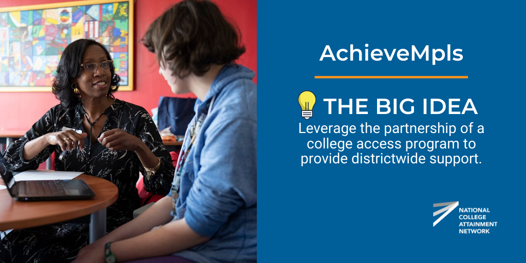 In February, NCAN released “The Data That Matter and the Plans That Work: New Districtwide Approaches to Student Success Beyond High School,” a collection of case studies about five school districts and partner organizations participating in the To & Through Advising Challenge. These organizations’ “big ideas” center on changing postsecondary advising by incorporating fit and match in college selection, improving FAFSA completion, reducing summer melt, and using postsecondary outcomes data to inform practice. This post focuses on AchieveMpls in Minneapolis, Minnesota, whose big idea is leveraging the partnership of a college access program to provide districtwide support.