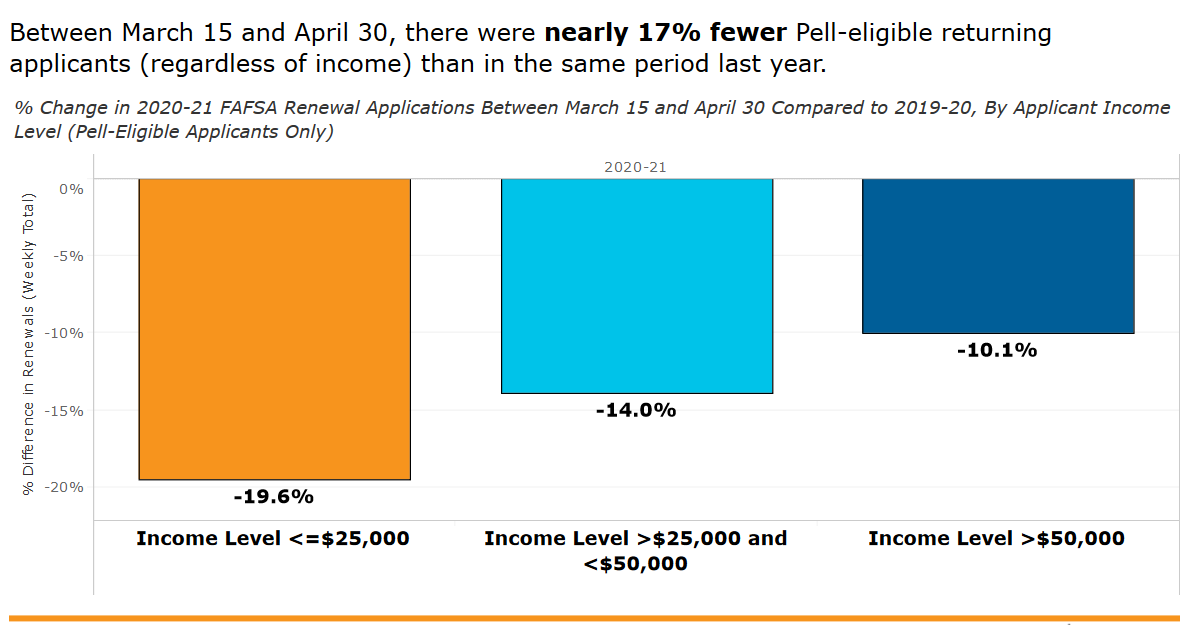 Readers of the NCAN blog hardly need to be reminded that even in a “normal” year the lowest-income students have the highest barriers to hurdle, and in the face of a global pandemic, the field is seeing FAFSA declines that in real-world terms suggest changing postsecondary plans for next year.