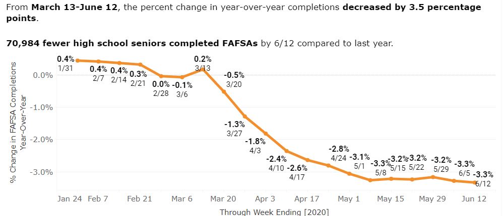 Starting with high school seniors, through June 5, NCAN estimates that 54.6% of the class of 2020 has completed a FAFSA (June 12 data will be out by the time you’re reading this article). Unsurprisingly, Tennessee (75.8%) and Louisiana (72.0%) are tops