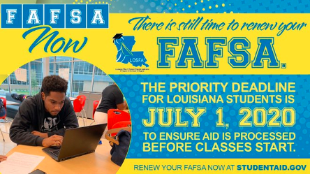 its FAFSA Now campaign to support students with FAFSA completion. The campaign began April 9,, and ended on July 1, the priority deadline for TOPS, Louisiana’s merit-based scholarship. The campaign targets high school seniors in the class of 2020