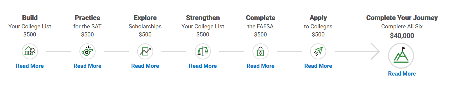All steps will earn students a chance at a $500 scholarship. (Previously, scholarship amounts differed from step to step.) College Board will give away 1,000 scholarships per month for building a list of colleges as well as for SAT practice during the