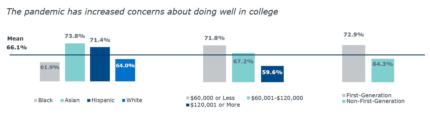 To be fairly understated: the COVID-19 era is a stressful time. Hispanic students, students from low-income backgrounds, and first-generation students all reported increased concerns about their ability to do well in college. The chart below shows the