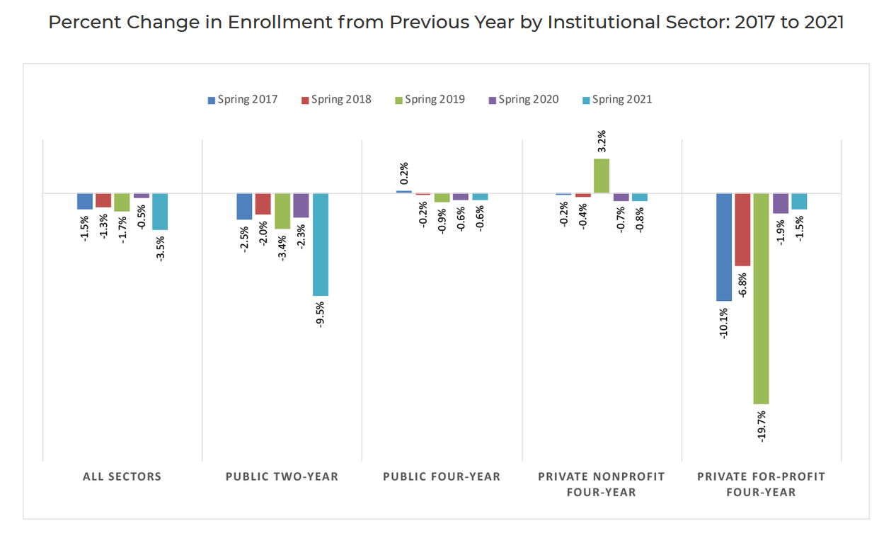 The report is the latest in a string of depressing releases from the NSCRC. The High School Benchmarks report published in March showed a 6.8% decline in fall college enrollment, which