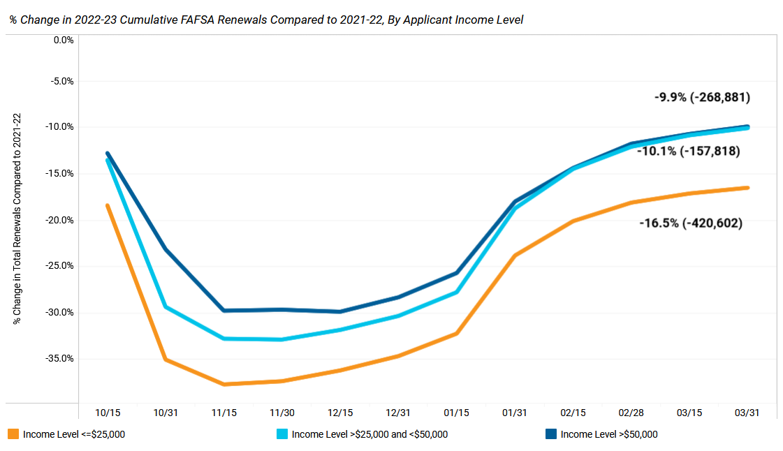 There are many plausible explanations for these steep declines in FAFSA renewals, but it’s hard to pin this performance on any one of them.