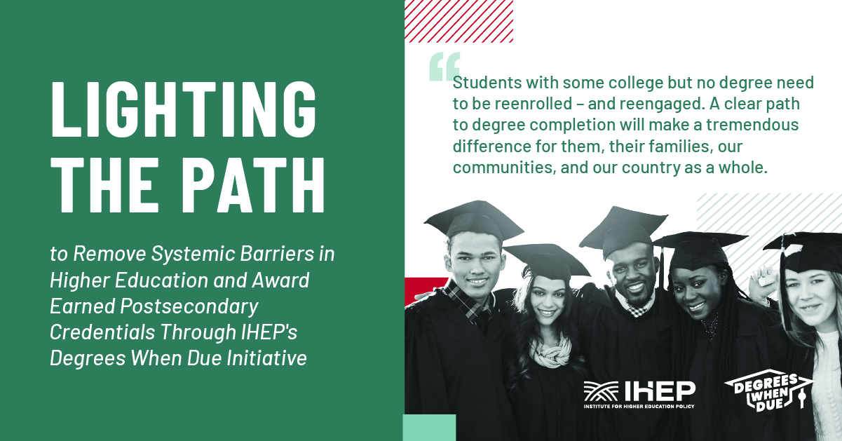 In partnership with the University of Utah, IHEP recently released the results of the DWD initiative in a report titled, “Lighting the Path to Remove Systemic Barriers in Higher Education and Award Earned Postsecondary Credentials.”
