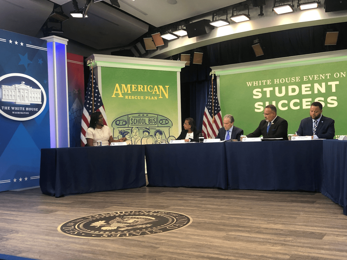 Rice, pictured above with Baltimore City Public Schools CEO Dr. Sonja Santelises, presidential Senior Advisor Gene Sperling, U.S. Secretary of Education Miguel Cardona, and AmeriCorps CEO Michael D. Smith.