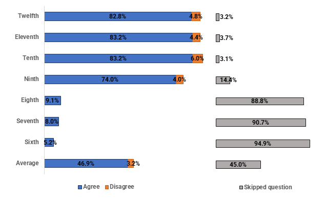 11th, and 12th grade teachers all had similar agreement rates. Though despite their differences, all grades showed an above 50% agreement rate.
