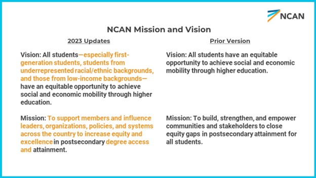 First, NCAN updated our vision and mission statements to explicitly reference racial and ethnic equity and made additional changes to clarify the scope of our work, as shown in the graphic below.