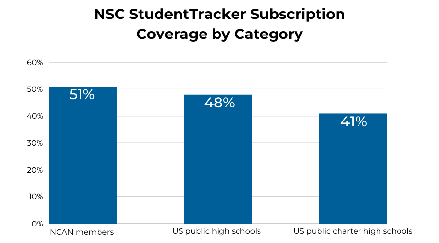 Of nearly 500 NCAN members, 250 (51%) have a StudentTracker subscription, according to the NSC. This coverage is higher than both public high schools (48%) and public charter high schools (41%), as noted by the most recent High School Benchmarks report.