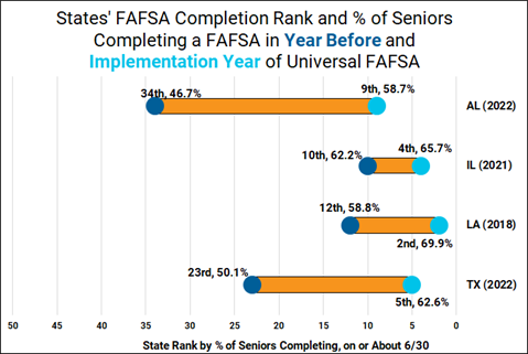 The National College Attainment Network (NCAN) typically finds that when a state implements a universal FAFSA policy, both FAFSA completion rates and state rankings increase. States with relatively