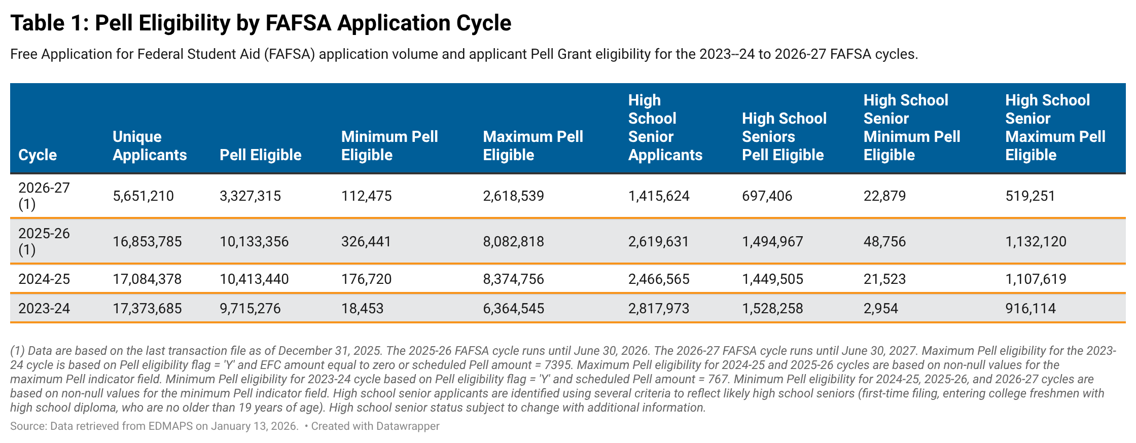 1.7 million more students were eligible for maximum Pell Grants in the 2025-26 Free Application for Federal Student Aid (FAFSA) cycle - a 27% jump compared to the 2023-24 pre-FAFSA simplification cycle (see table 1). The increase represents a 27% increase