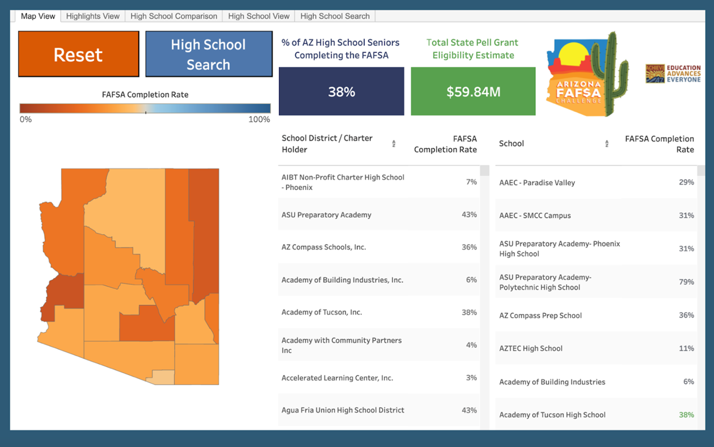 Arizona also has a strong FAFSA dashboard that allows anyone to compare schools, look at individual high schools, and view total estimated Pell Grant funding derived from FAFSA completion.
