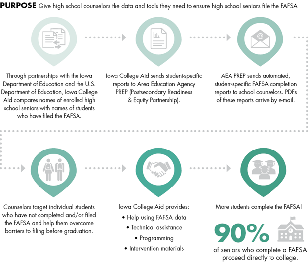 All schools now receive weekly FAFSA reports from their regional AEA PREP (Area Education Agencies’ Postsecondary Readiness and Equity Partnership), which has data-sharing agreements with local schools. These reports are stored in a Google Drive folder