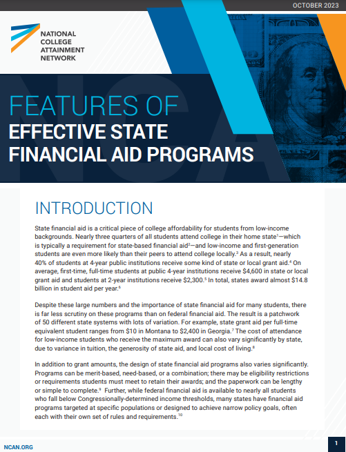 State financial aid is a critical piece of college affordability for students from low-income backgrounds. Despite this, there is far less scrutiny on these programs than on federal financial aid. The result is a patchwork of 50 different state systems with lots of variation. This report describes the effective features of state financial aid programs as a resource for our members working on advancing college affordability through state policy.