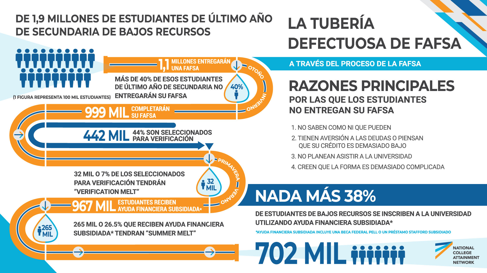 The Free Application for Federal Student Aid (FAFSA) effectively serves as the gateway to higher education for millions of students each academic year. However, the complex and extensive nature of the FAFSA has resulted in the significant underutilization of federal aid. In fact, just 58% of high school seniors complete the application by the time they graduate, leaving $24 billion in federal and state aid unclaimed. Additionally, a significant portion of students apply for aid but do not enroll in a higher education institution. Only 38% of students from low-income backgrounds enroll in higher education with the assistance of a Pell Grant, suggesting that this issue disproportionately affects students with fewer financial resources. NCAN's research demonstrates this is indeed the case. For more information on the importance of FAFSA completion, please see "Why Invest in Increasing FAFSA Completion?" Congress passed the crucial FAFSA Simplification Act to improve the process of applying for federal student aid. Part of the Consolidated Appropriations Act of 2020, the FAFSA Simplification Act achieves two of NCAN’s primary goals for FAFSA simplification. The law will: