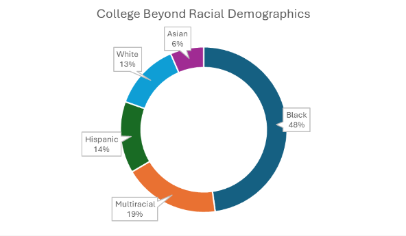 Location: New Orleans, LA Programming SummaryCollege Beyond’s approach to student support focuses on two main strategies: trauma-informed coaching and microgrant funding. The staff is trained to deliver trauma-informed coaching to address students’ previous and current life experiences so that they have the support needed to progress through college. They employ social work interns for extra support and case management to further meet students’ needs. The microgrants assist with the hidden costs associated with attending college, such as food and transportation costs, but which also includes using the funds for in-person mental health help costs to receive local in-person therapy. A partnership with Kresge provides students with access to free online counseling through the META app. College Beyond also built both mental wellness programming and environmental support including art therapy, stress-relief activities, and providing students with a student lounge where they can decompress and recharge in a safe, comfortable, and supportive environment. They also provide healthy snacks and water to their students in their student lounge. DemographicsThe only eligibility criterion for College Beyond is need. College Beyond is designed for an underserved middle majority of college students: capable youth who have earned admission to college but generally are not eligible for top merit-based financial aid or selective college persistence programs. College Beyond’s 2022-23 cohort of students are 85% people of color, 87% are first-generation graduates, and 98% Pell Grant recipients.